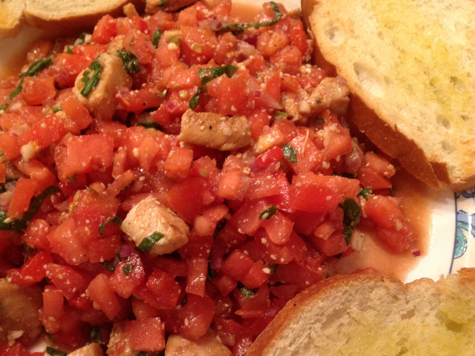 But no worries, our version turns this delicious appetizer into a hearty bruschetta salad with tomatoes and roasted red peppers, grilled chicken breast for protein and a couple crispy garlic toasts for crunch.