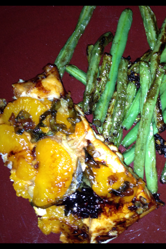 MMM orange glazed salmon, we've had many variations at many different restaurants and loved each one! We don't know about you, but when we hear glaze, we hear calories and certainly don't like that! Like we have said, we like to try and include heart healthy fatty fish into our weekly diets so, we wanted to try and recreate this meal idea, and feel good about eating it! The 'glaze' in this recipe comes from mandarin oranges, lemon juice, fresh ginger, garlic, soy sauce and a just a hint of brown sugar! The fish comes out of the oven with so much flavor, it's hard to believe it's actually good for you! We chose to serve this dish up with fresh green beans, simply sauteed up with a bit of soy sauce and garlic.