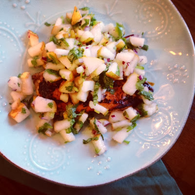 4. Plate up chicken and top with 1/4 of the pear salsa.