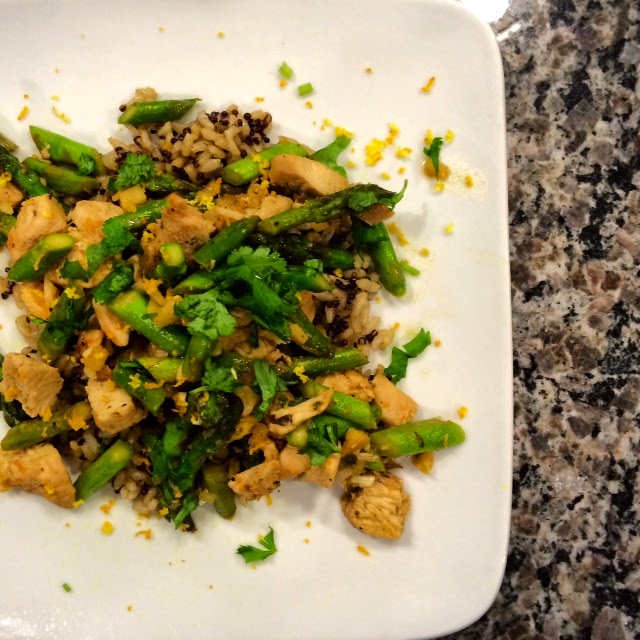 We then saute up half lean chicken breast and half vegetables (we used asparagus!). The sauce is a simple combination of orange juice, lime juice & a splash of soy sauce. It's sweet from the orange juice but a little spicy from the freshly grated ginger.